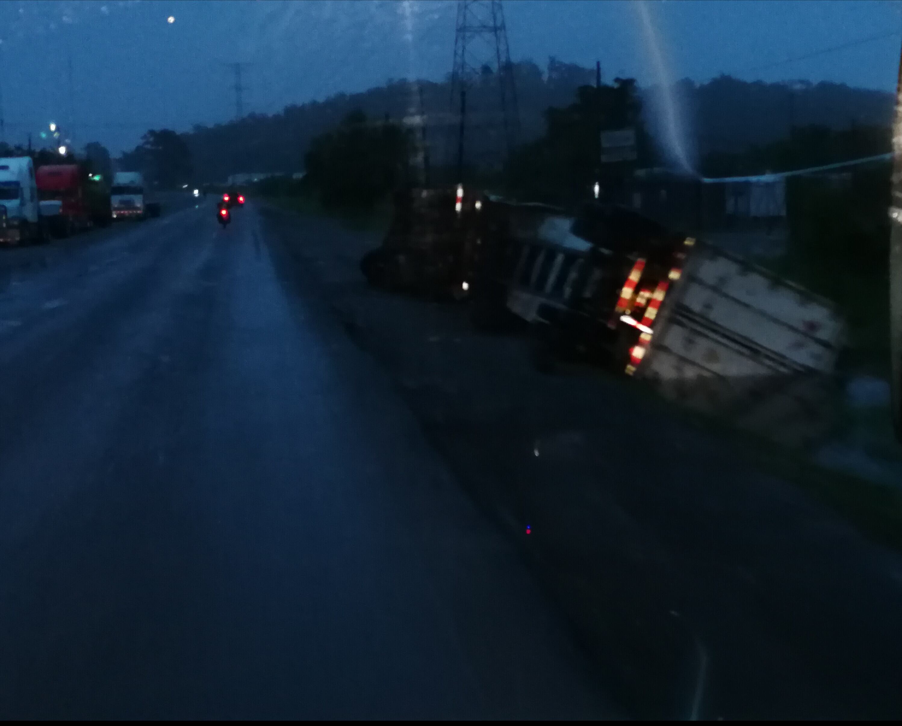 Cerca de la Universidad Earth, en Guácimo, Limón, un tráiler volcó a las 10 p. m. del sábado cuando sufrió el impacto de una rama de un árbol que se desprendió. El chofer perdió el control y chocó contra un árbol a un lado de la carretera.