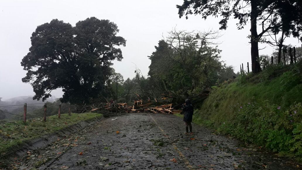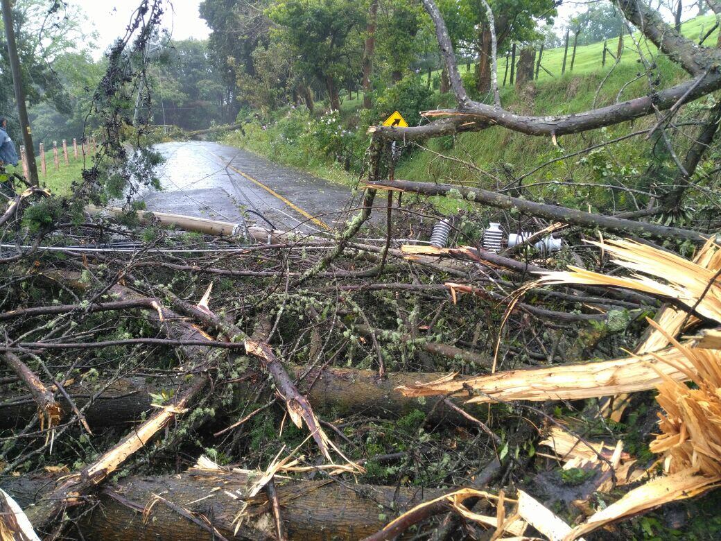 En la carretera que comunica Rancho Redondo con Coronado el paso estaba totalmente cerrado esta mañana, pues a unos 2 kilómetros al oeste de la iglesia de Llano Grande varios árboles de ciprés cayeron sobre la vía al tiempo que se llevaron consigo postes y tendido eléctrico.