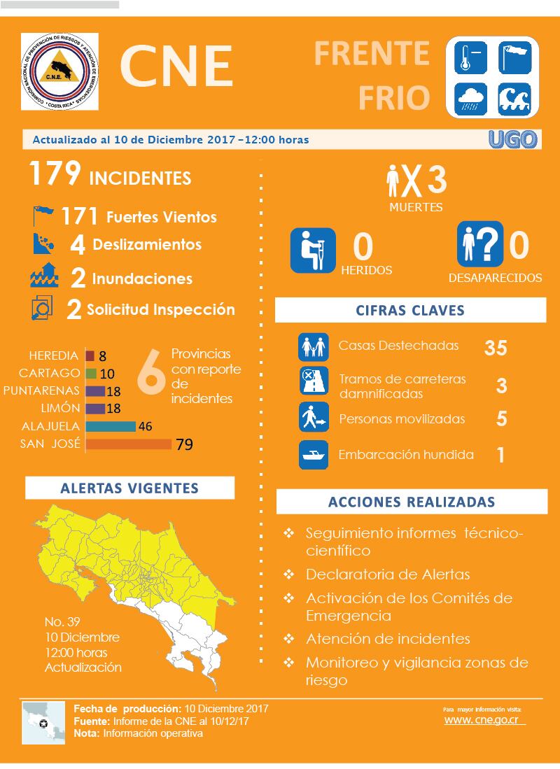 El frente frío que ingresó al país al final del sábado ha provocado este domingo tres fallecidos por caídas de árboles y dos heridos, así como el cierre de la ruta 32 –hacia Limón– por deslizamientos, 35 casas destechadas y numerosos cortes de electricidad en diversos sectores.