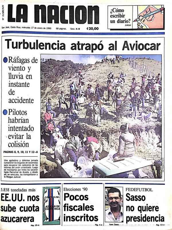 - El 15 de enero de 1990, una avioneta con 23 pasajeros se desplomó en las montañas de Escazú, en la zona de Pico Blanco. Todos murieron. Era la aeronave matrícula TI-SAB. Iba piloteada por Carlos Echeverría Rodríguez, de 40 años, quien se dirigía del aeropuerto Juan Santamaría hacia Palmar Sur. Viajaban nueve costarricenses, siete canadienses, tres panameños, un estadounidenses, un sueco y dos extranjeros más, cuyas nacionalidades no se precisaron en ese momento.