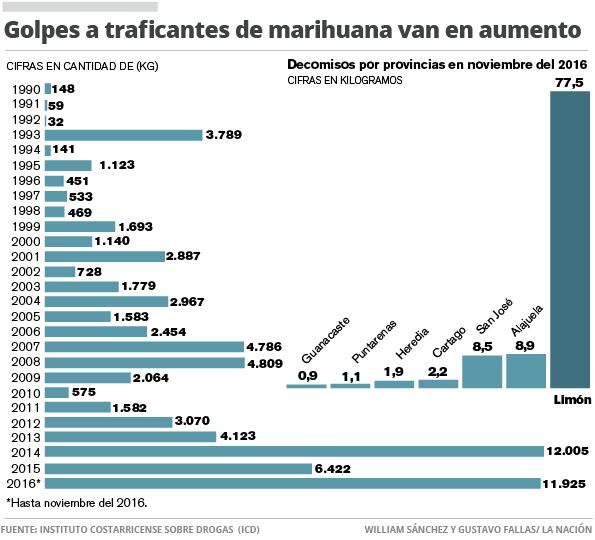 De acuerdo con los registros del ICD, en noviembre del 2016 se decomisaron 101 kilos de la hierba. De estos, 77,5 kilos fueron confiscados en Limón. Esta provincia es una especie de centro de logística, pues aquí llega la mayoría de embarcaciones con la droga procedente del Caribe; además, tiene dos cantones con alta producción (Siquirres y Talamanca).