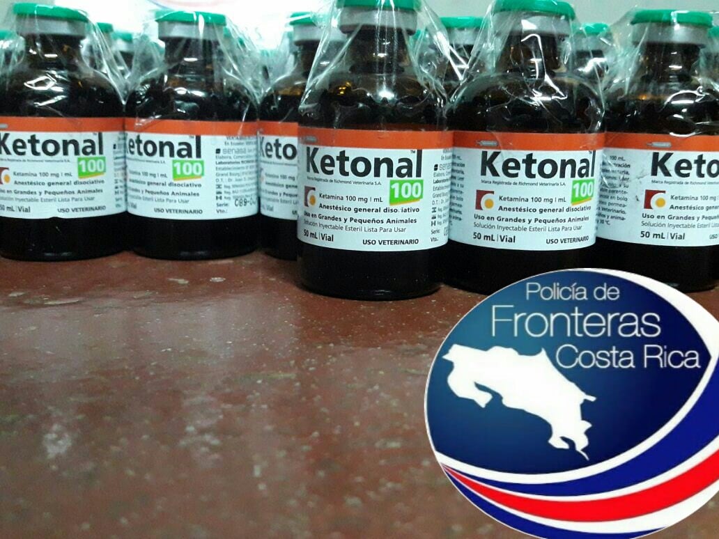 "Los oficiales invitaron al hombre a mostrar lo que llevaba en los bolsos, se trataba de 304 frascos del fármaco conocido como ketamina (cada uno de 100 mililitros), el cual también es comercializado con el nombre de ketona", precisó Allan Obando, director de la Policía de Fronteras.