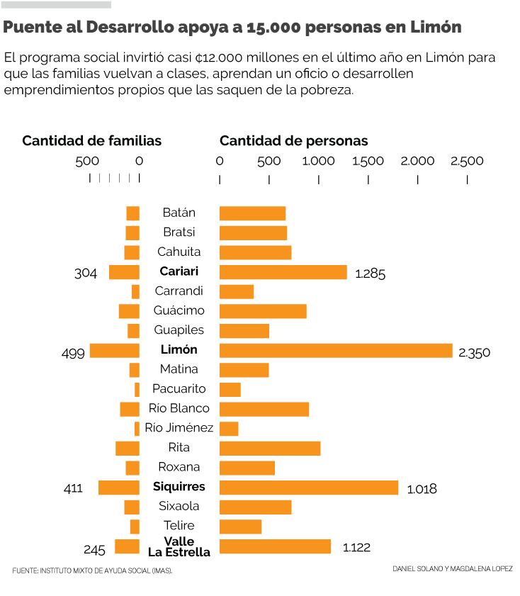 Además, Puente al Desarrollo es otra iniciativa gubernamental que pretende que la población pobre de Limón reciba asistencia económica para educación, capacitación y desarrollo de iniciativas productivas.