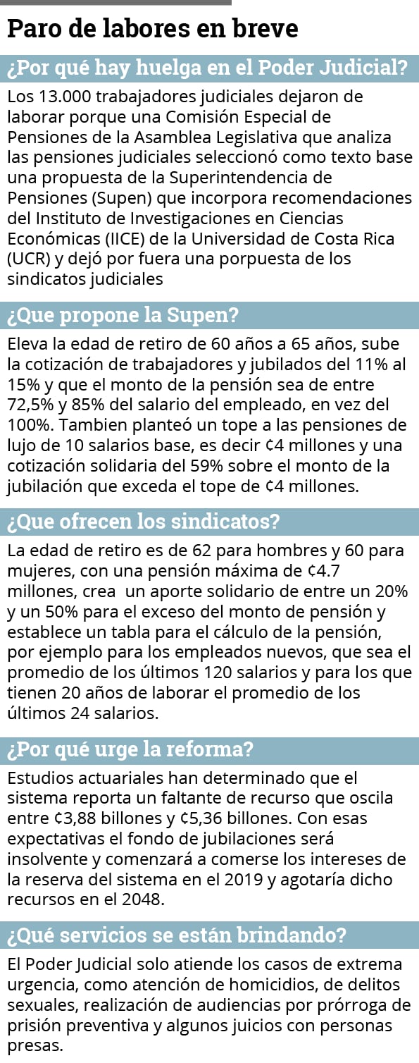Desde las 9 a. m., cientos de trabajadores del Poder Judicial se congregaron frente a la Asamblea Legislativa para pedirle a los diputados que incorporen el texto propuesto por los gremios en la reforma a su régimen de pensiones.