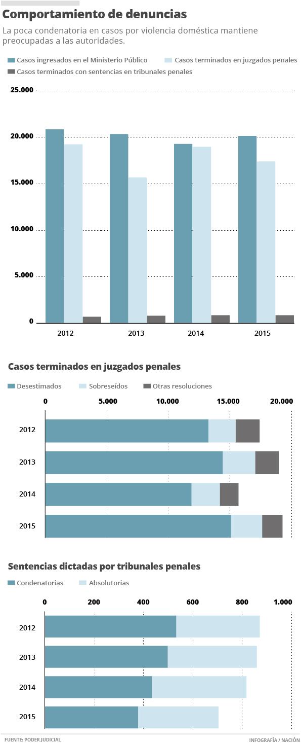 Por ejemplo, en el 2015 se recibieron 20.143 casos por la Ley de Penalización de Violencia en contra de la Mujer (creada hace casi diez años); no obstante, solo 871 culminaron con una sentencia condenatoria (532) o absolutoria (339), según datos de la Sección de Estadística del Poder Judicial.