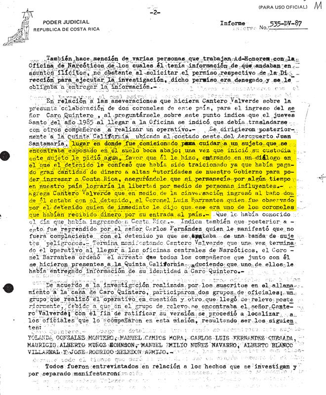 “El detenido (Caro Quintero) le confesó (a Cantero) que había sido traicionado, ya que había pagado gran cantidad de dinero para ingresar a Costa Rica, asegurándole que si permanecía por algún tiempo en nuestro país lograría la libertad por medio de personas influyentes”, detalla el informe N.° 535-DV-87, que se encuentra en el Archivo Nacional.