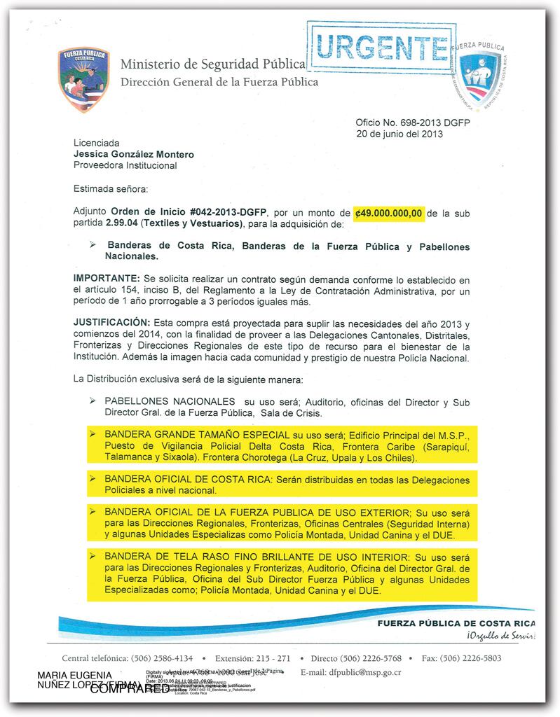 La Fuerza Pública invitó a una distribuidora de productos farmacéuticos a concursar en la venta de 1.571 banderas de Costa Rica para ese cuerpo de seguridad, por un monto de ¢49 millones .