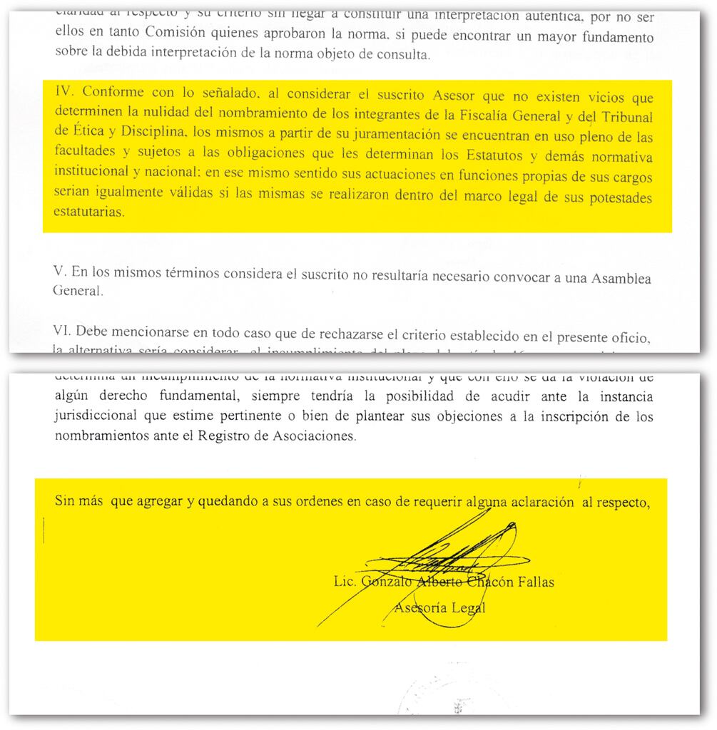 Al respecto, el abogado Gonzalo Alberto Chacón Fallas, uno de los asesores legales, en un informe que rindió el 18 de mayo, consideró : “No existen vicios que determinen la nulidad del nombramiento de los integrantes de la Fiscalía General y del Tribunal de Ética”.
