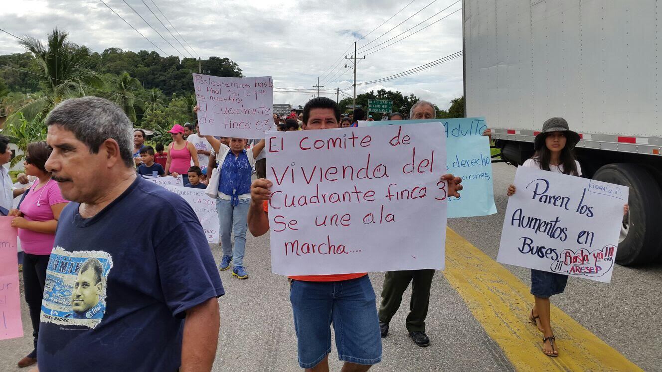 Al menos cinco grupos con alegatos distintos se manifiestan en la carretera. El grupo líder son los campesinos que fueron desalojados hace unos meses de las fincas 2-4 y 3 en Palmar Norte.