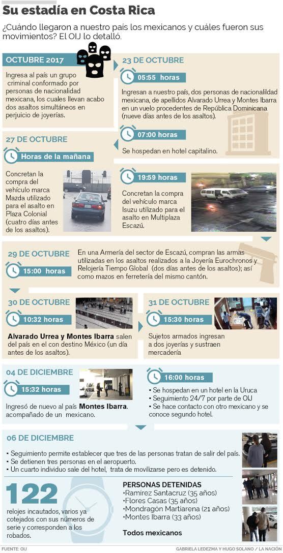 Según las autoridades, esta es una banda que tiene a su jefe en México, tiene contactos internacionales, responde a órdenes establecidas, maneja importantes sumas de dinero y planea muy bien los golpes. Ellos entraron y salieron del país por el aeropuerto Juan Santamaría en muchas ocasiones y en un espacio temporal muy corto.