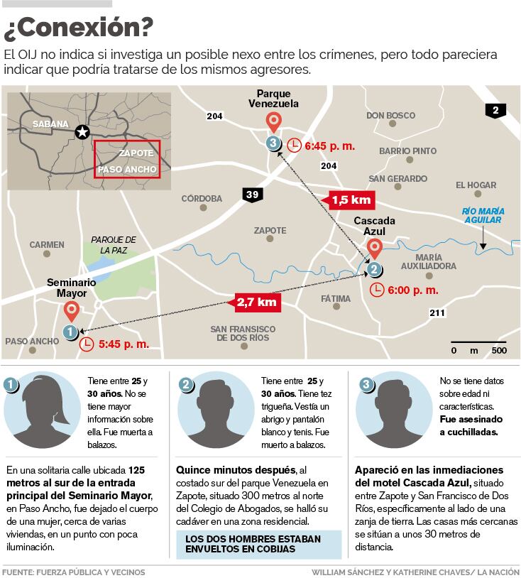 El Organismo de Investigación Judicial (OIJ) no ha confirmado que se esté investigando un posible nexo entre los tres crímenes, y se está a la espera de las respectivas autopsias, que podrían extenderse durante varios días.
