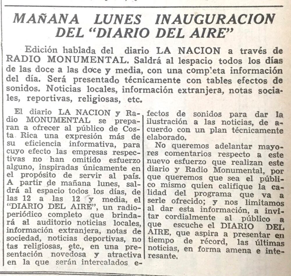 Ese año surgió El Diario del Aire , un programa que se transmitía por Radio Monumental, de 12 m. d. a 12:30 p.m. a manera de resumen de las noticias de La Nación.