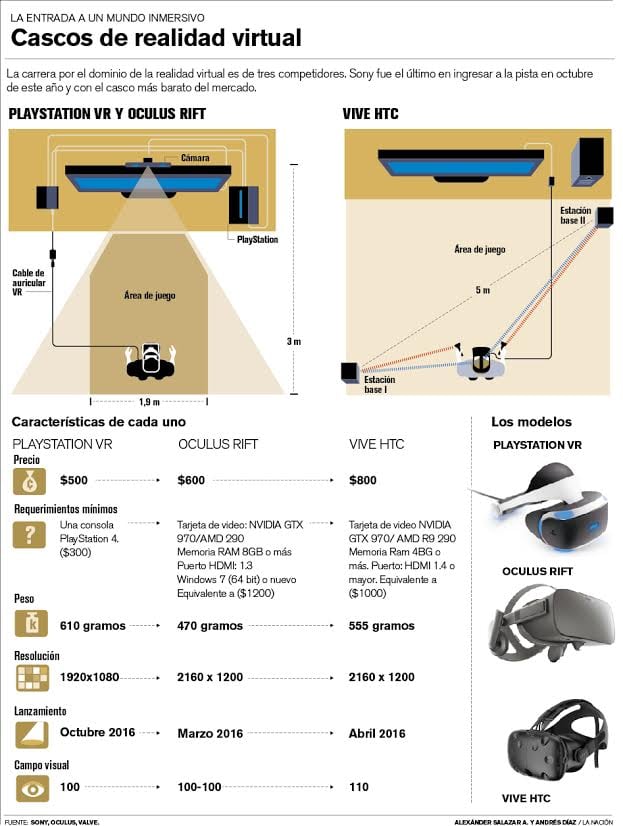 Los precios de estos cascos oscilan entre $500 (unos ¢280.000) y $800 (cerca de ¢449.000), y, a parte, requieren de un dispositivo externo para funcionar. El PSVR, de Sony, requiere de un PlayStation 4 que cuesta $400 (¢224.000), mientras que el VIVE y el Oculus, para funcionar, necesitan de una computadora potente que supera los $800. Ver aspectos en la infografía.