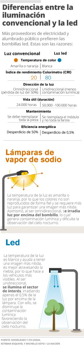 Otros. Algunas firmas distribuidoras de electricidad y alumbrado público ya hicieron el cambio a led. Por ejemplo, la Cooperativa de Electrificación Rural de San Carlos (Coopelesca) sustituyó 29.000 lámparas.