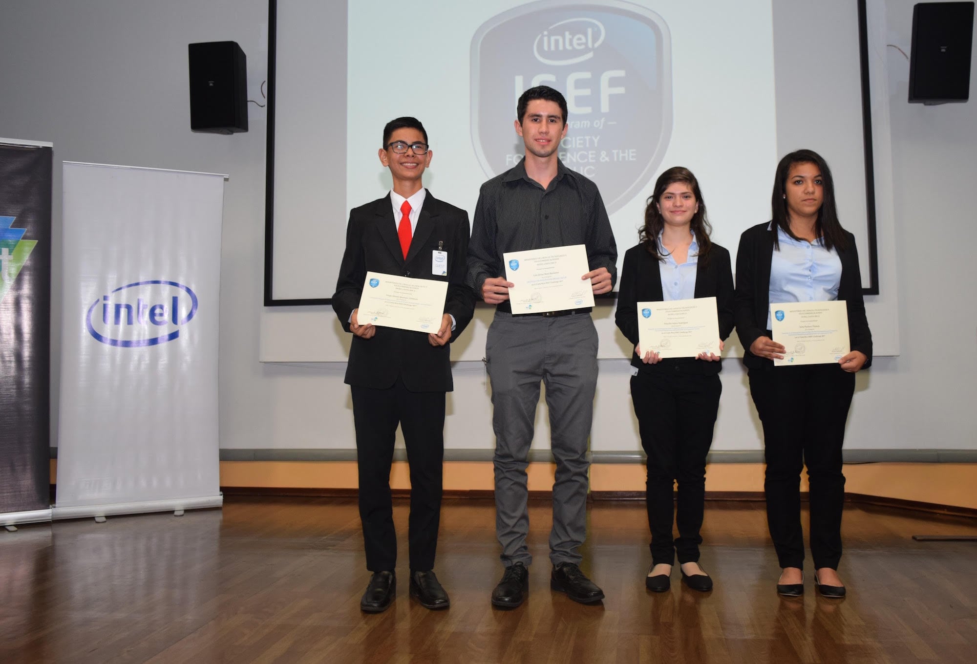 Priscilla Solera, Sofía Pacheco, Diego Martínez y Luis Javier Mora son los ganadores del Costa Rica ISEF Challenge, una competencia organizada por Intel y por el Ministerio de Ciencia, Tecnología y Telecomunicaciones (Micitt).