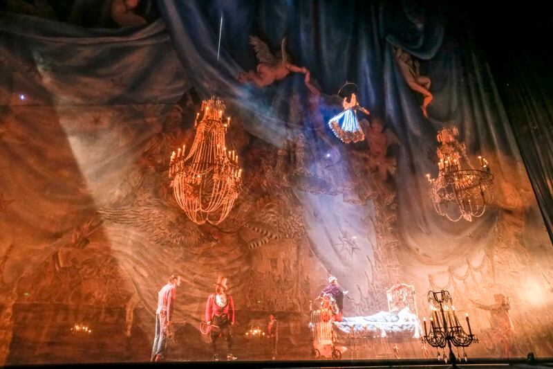 Antes de partir, Mauro ve pasar la vida ante sus ojos. Están los recuerdos de los amores pasados, representados en las acrobacias de cuatro bailarinas aéreas en tres candelabros gigantes, y las memorias de la infancia, interpretadas por ocho osados gimnastas que saltan de una cama a otra como si no hubiera gravedad.