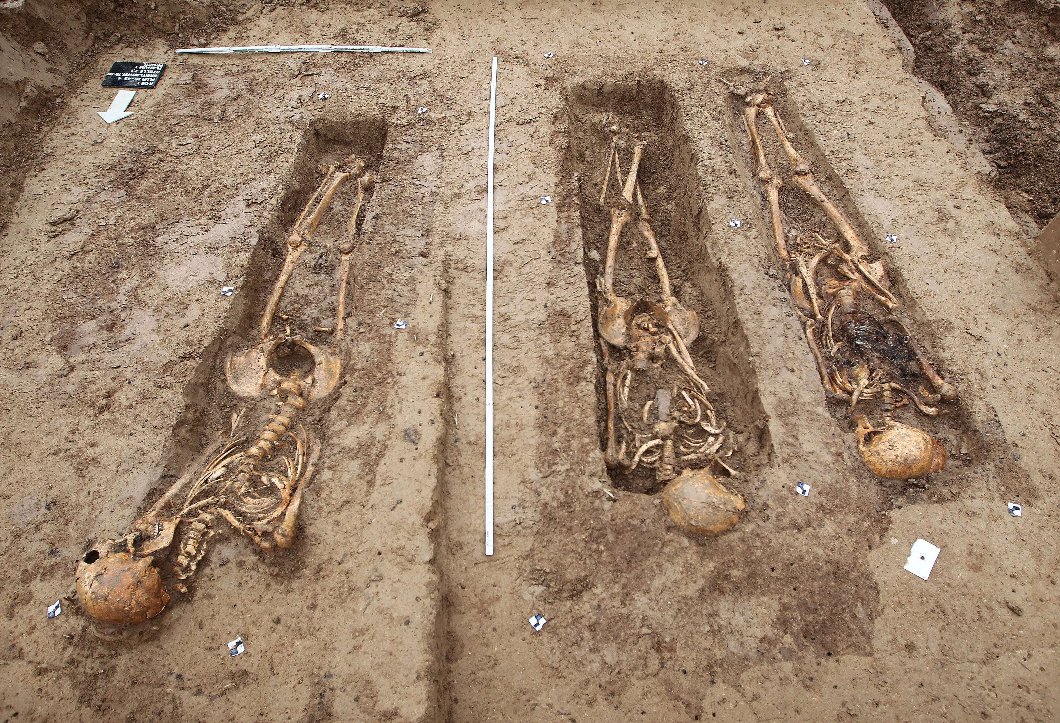 Además, están alineados con una orientación Norte/Sur, en tanto que en la Europa cristiana se tenía la costumbre de enterrar los cuerpos de los muertos sobre un eje Este/Oeste. Un signo de que fueron enterrados de manera apurada, según Hampel.