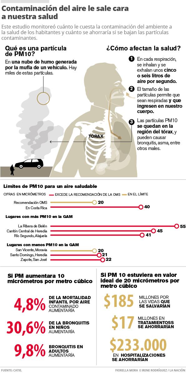 Si las concentraciones de partículas contaminantes estuvieran en su límite recomendado por la Organización Mundial de la Salud (OMS), se ahorrarían, cada año, $17 millones (casi ¢10.000 millones) en la atención de las bronquitis (y su impacto en incapacidades y calidad de vida), $55.000 (¢31,3 millones) en asma y $233.000 (¢132,8 millones) en hospitalizaciones.