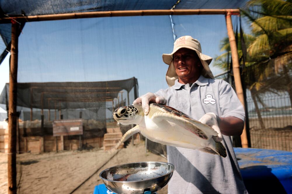 Erick Alguera es uno de los biólogos que atienden tortugas en Moín. Previo a su liberación, pesó y midió a Esperanza. | JOHN DURÁN (JOHN DURAN)