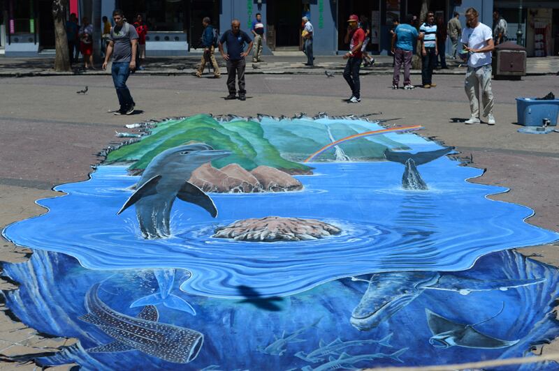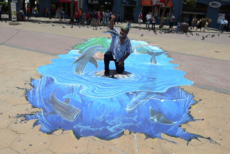 Poco a poco, los transeúntes curiosos empezaron a hacer una pausa en su camino, para acercarse a ver qué era aquella isla, en medio del concreto cubierto por cuitas de paloma. Algunos dudaban y no comprendían bien cómo era la dinámica del juego, pero otros, de una vez, se sentaban sobre el “peñasco” que emergía del “agua” para retratarse entre delfines, ballenas jorobadas, tiburones martillo y mantas.
