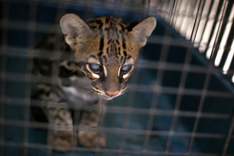 Nicoa, un manigordo (Leopardus pardalis) macho de tres kilogramos y cuatro meses de edad, fue decomisado por funcionarios del Área de Conservación Tempisque (ACT) a los peones de una finca y trasladado al centro de rescate Las Pumas, en Cañas (Guanacaste), para ser rehabilitado y, posteriormente, liberado en el bosque.