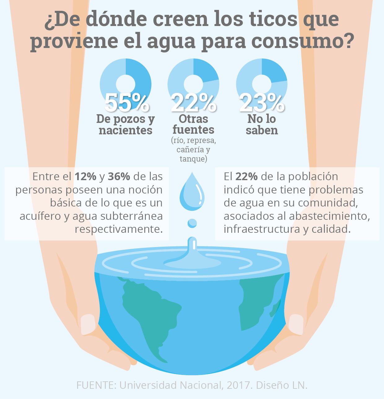 Asimismo, el 55% cree que el agua proviene de pozos y nacientes, mientras que un 22% aduce que viene de ríos, represas, cañerías y tanques. Para Alfaro, lo más sorprendente es que el 23% no sabe del todo de donde viene el agua que utiliza diariamente en su casa o trabajo.