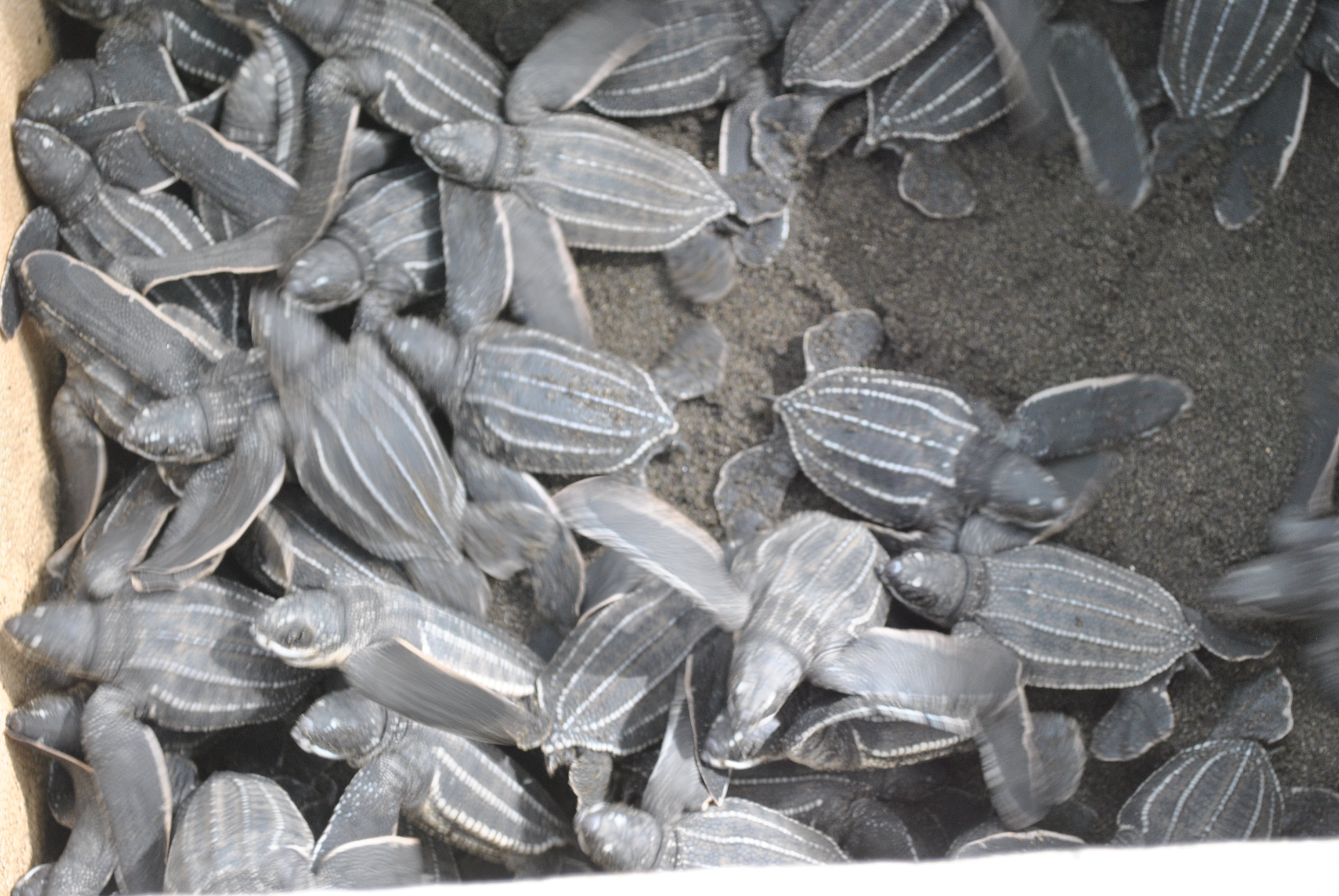 "Estas tortuguitas corresponden a la eclosión parcial de dos nidos de tortuga baula, sus madres anidaron en Moín durante la parte final de abril y después de dos meses, los huevos eclosionaron", comentó Chacón.