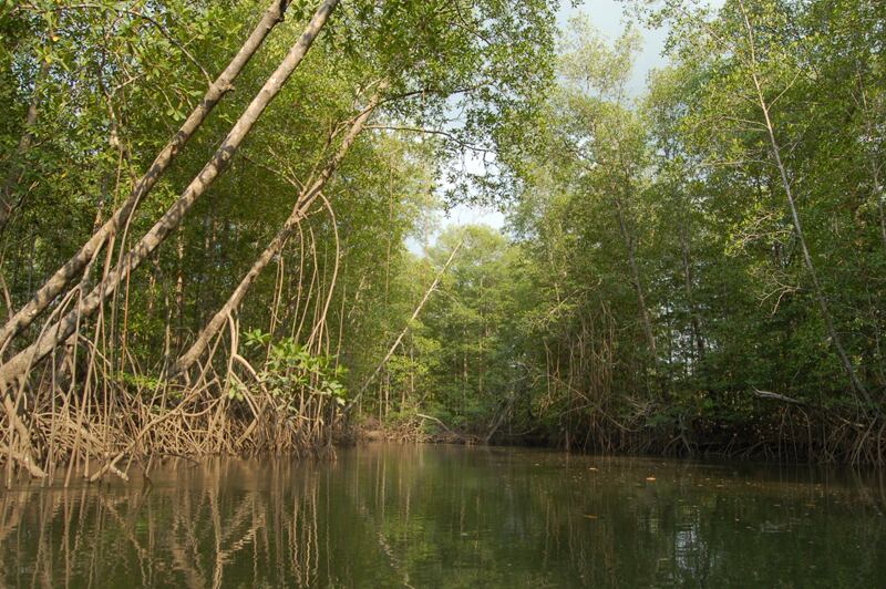 En Rincón de Osa, cerca del río, la cotinga piquiamarilla (Carpodectes antoniae) se deja ver en la parte alta del mangle y en los árboles de los bosques cercanos a estos.