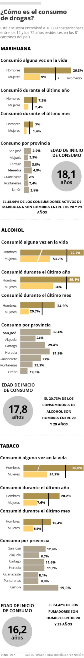 La encuesta, aplicada a 16.000 personas, confirmó que el alcohol sigue siendo la droga más consumida entre los costarricenses. El 63,3% asegura haber tomado licor alguna vez en la vida, el 41,6% ha ingerido este tipo de bebidas en el último año y el 27,9% ha tomado en el último mes (34,9% de hombres y 20,7% de mujeres).