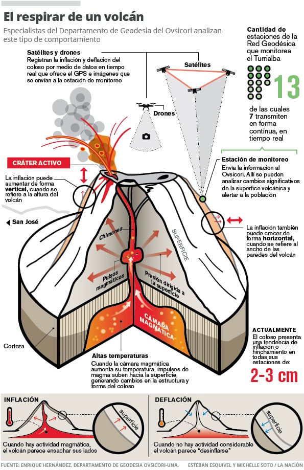 Tal inflación provoca que la corteza terrestre se deforme y, eso es, precisamente, lo que estudian en el volcán Turrialba, Enrique Hernández, Marino Protti y Cyril Muller, investigadores del Observatorio Vulcanológico y Sismológico de Costa Rica (Ovsicori).