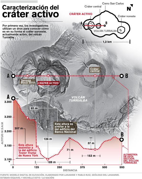 De esta manera, por primera vez en el país, los vulcanólogos lograron determinar que las paredes internas del cráter suroeste exhiben pendientes que superan los 55 grados de inclinación y eso otorga a la boca del volcán una profundidad de 126 metros, es decir, allí cabe 1,5 veces el edificio del Banco Nacional (que mide 82 metros de altura).