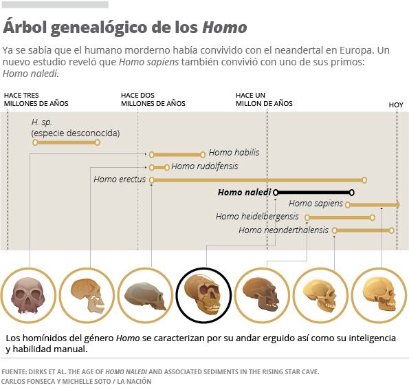 En el 2015, el Homo naledi fue incorporado al árbol genealógico de los homínidos. Los individuos de esta especie presentan un cerebro pequeño similar a los primeros homínidos y australopitecus, pero su tamaño es un tanto más grande que un chimpancé así como sus hombros, torso y dedos curvados recuerdan a especies más antiguas.