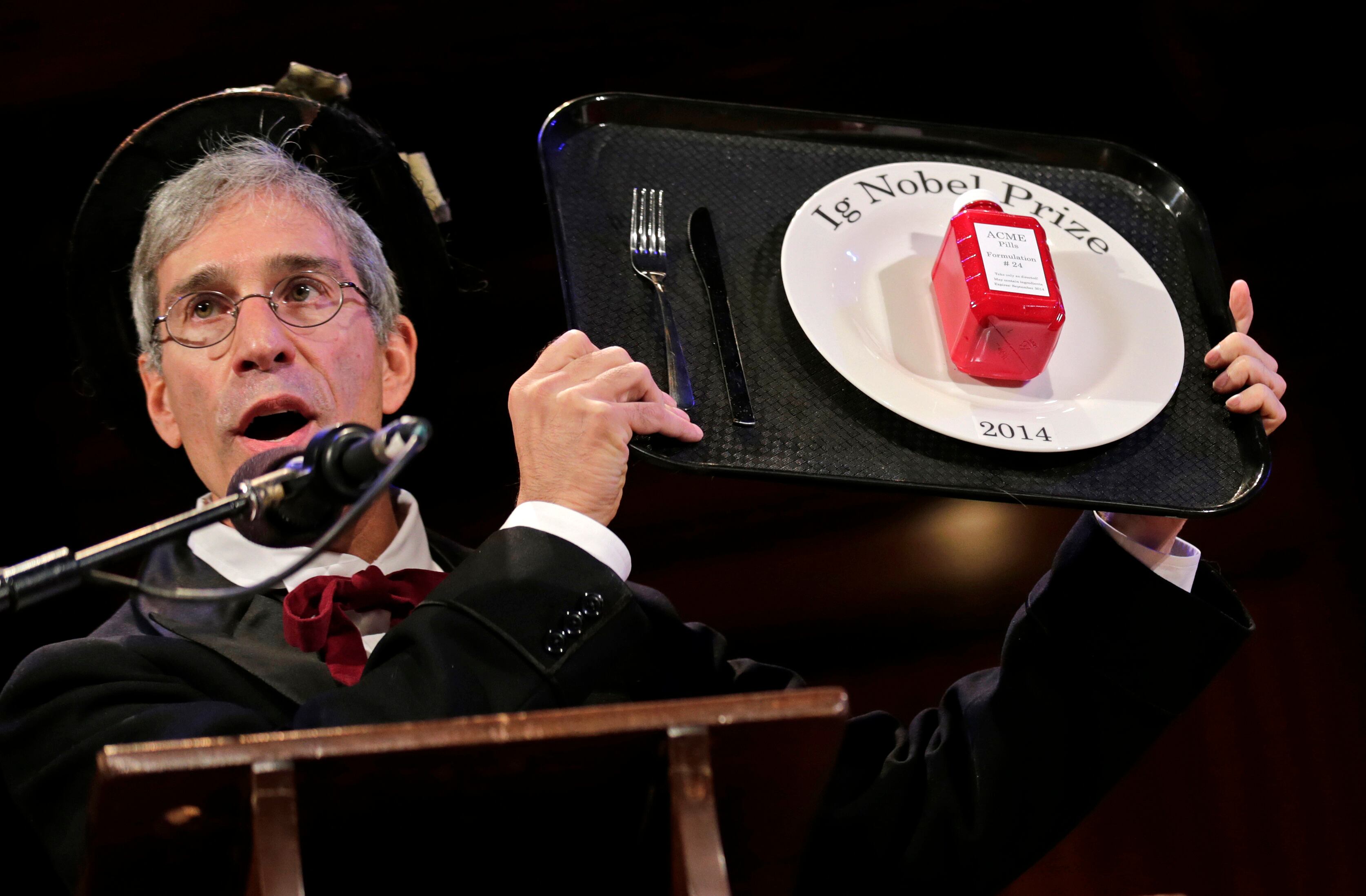 El maestro de ceremonias, Marc Abrahams, muestra el trofeo del Ig Nobel 2014 durante la ceremonia realizada en la Universidad de Harvard. (AP)