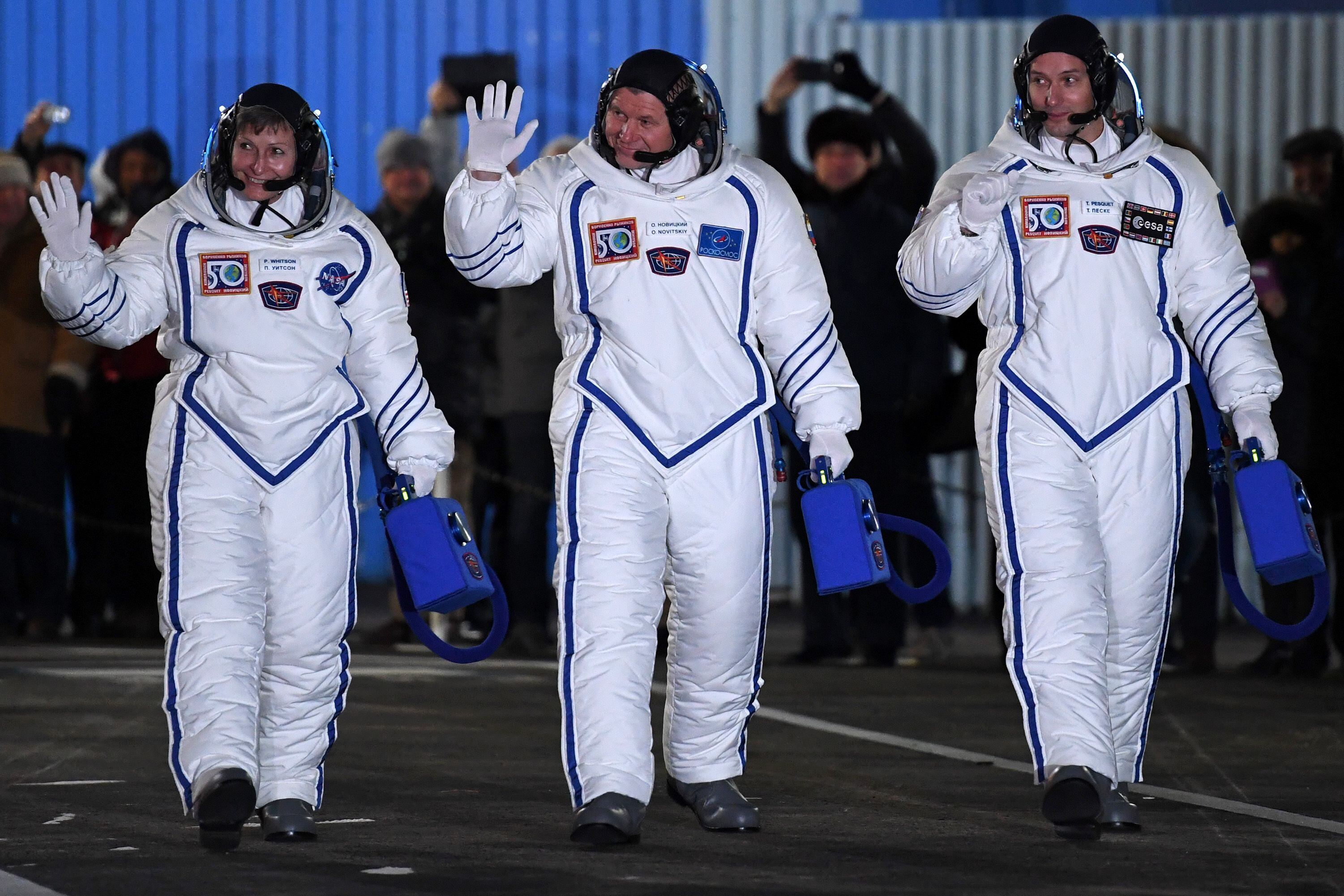 Oleg Novitsky, Peggy Whitson y Thomas Pesquet despegarán este jueves con destino a la Estación Espacial Internacional. (AFP)