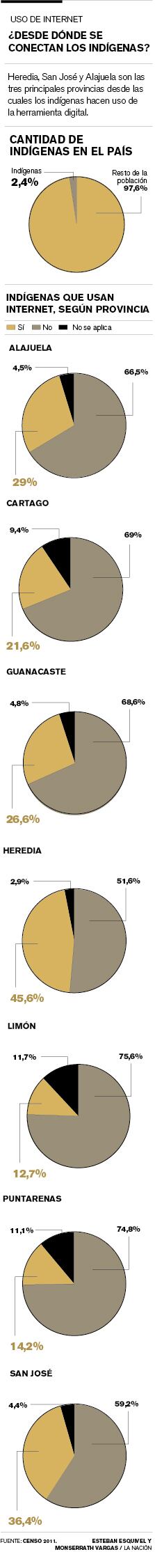 San José es la segunda provincia en la que los indígenas más usan Internet, con 36%. A esta la sigue Alajuela con 29%. Esas cifras contrastan con las de Puntarenas donde apenas un 14,2% lo usan y las de Limón, con un 12,7%.