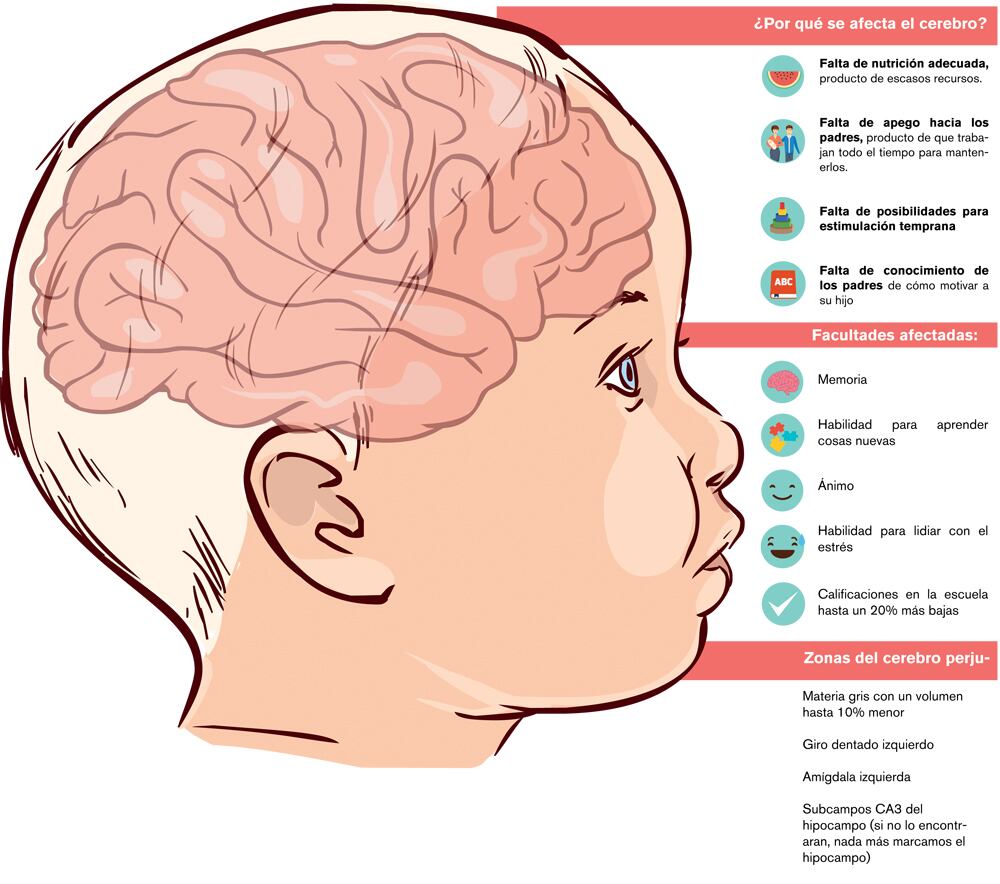 Un niño que nace en situación de pobreza no solo tendrá mayor riesgo de sufrir desnutrición y tener menos oportunidades, su desarrollo cerebral también se ve impactado y podría ser más lento y menor que el de menores de la misma edad con mayores posibilidades económicas.
