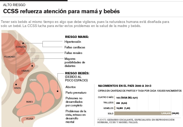 Gerardo Escalante, ginecólogo y obstetra especialista en medicina materno-fetal y en reproducción, asegura que los riesgos para la madre y la bebé son muy altos. “Una mujer embarazada de sextillizos tiene más riesgo de diabetes porque las placentas producen una sustancia que sube el azúcar, se eleva la presión arterial y hay más riesgo de falla renal, falla cardíaca o cerebral”, detalló el experto, quien dirige la especialidad de embarazo de alto riesgo de la Universidad de Costa Rica (UCR).