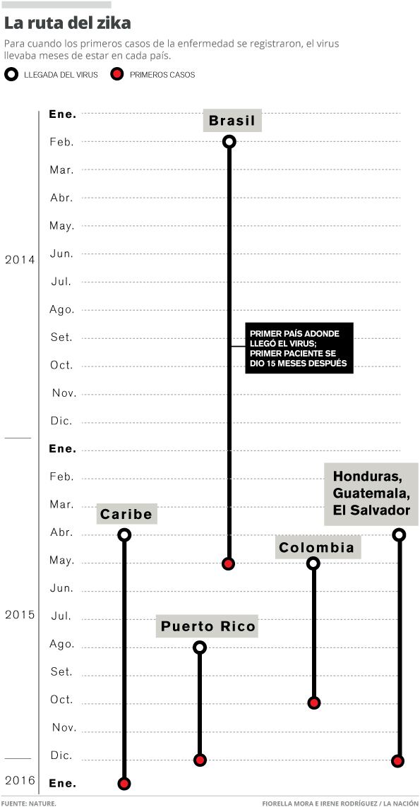 Por ejemplo, en Colombia se reportó el primer paciente en octubre del 2015, pero el zika ya estaba allí desde abril anterior. En Guatemala, El Salvador y Honduras las primeras personas con la enfermedad se dieron en diciembre del 2015, pero el patógeno había llegado desde abril.
