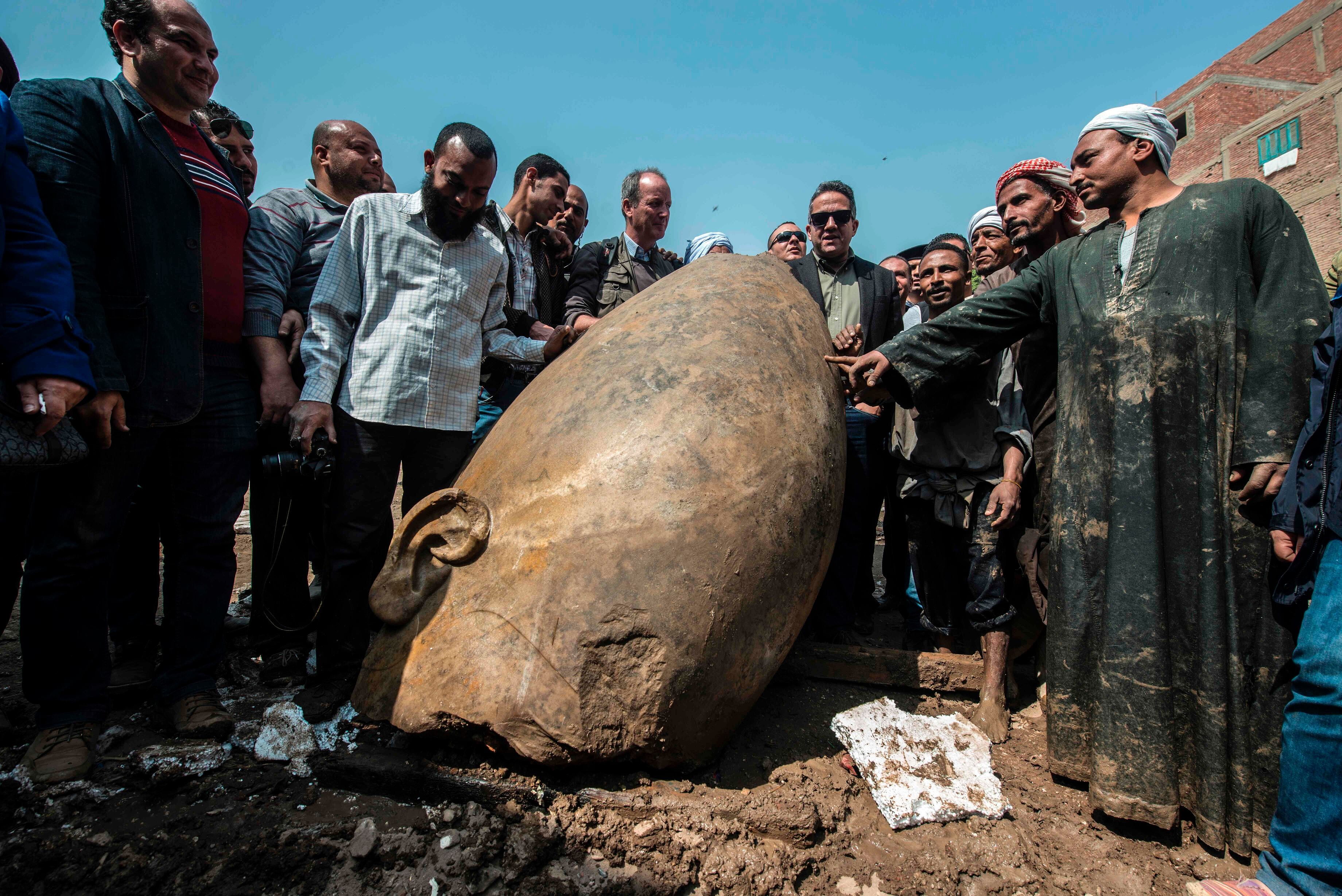 El ministro egipcio Khaled el-Anani posa para la foto con los trabajadores, al lado de la cabeza de una estatua aparecida en el distrito de Mattarya de El Cairo. (AFP/ KHALED DESOUK)