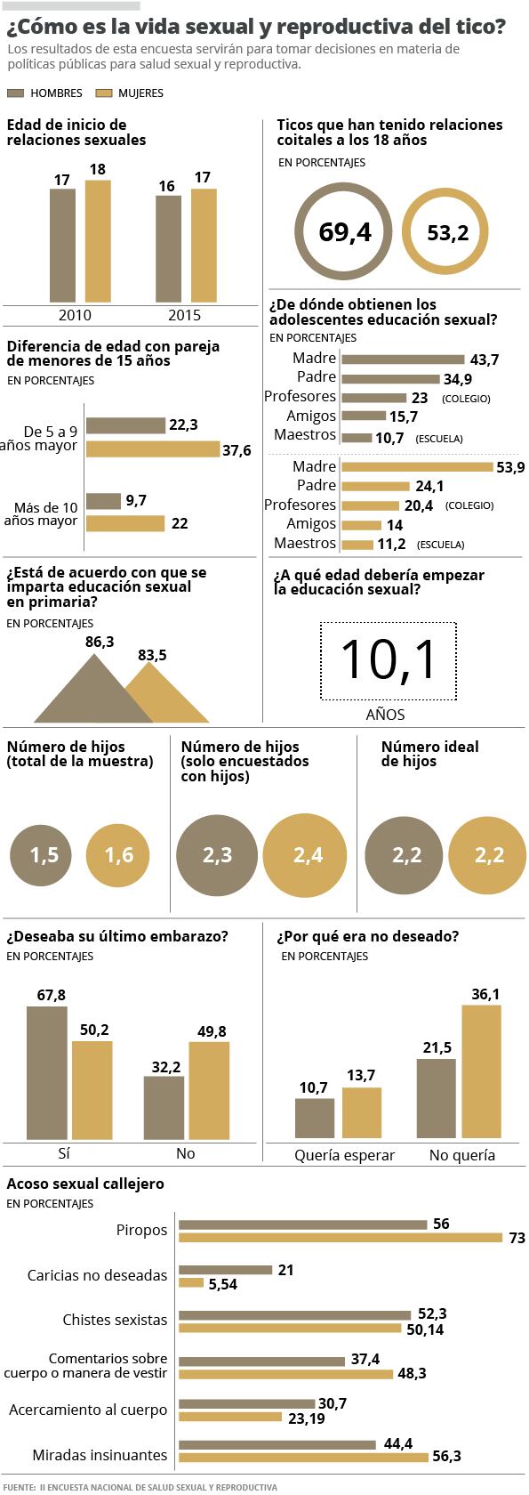 La encuesta también detectó que los jóvenes comienzan su vida sexual a edades más tempranas. En el 2010, los hombres tenían su primera relación sexual a los 17 años y las mujeres a los 18; para el 2015 ambos sexos habían bajado en un año su primera experiencia coital: ellos a los 16 años y ellas a los 17.