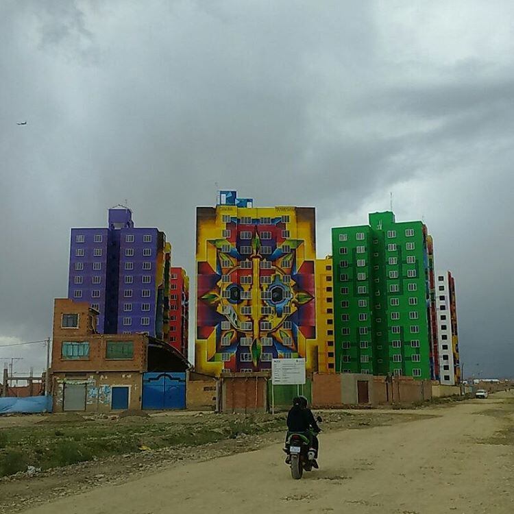 Por ejemplo, en la Comunidad Wiphala, situada en El Alto (La Paz, Bolivia) e inaugurada en febrero de este año, se pueden apreciar 14 murales del reconocido artista boliviano Roberto Mamani Mamani.
