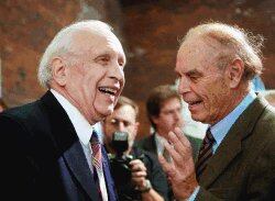 Roy Glauber (izq.) felicitado por Gerald Holton en Cambrige. | AFP (CJ GUNTHER)