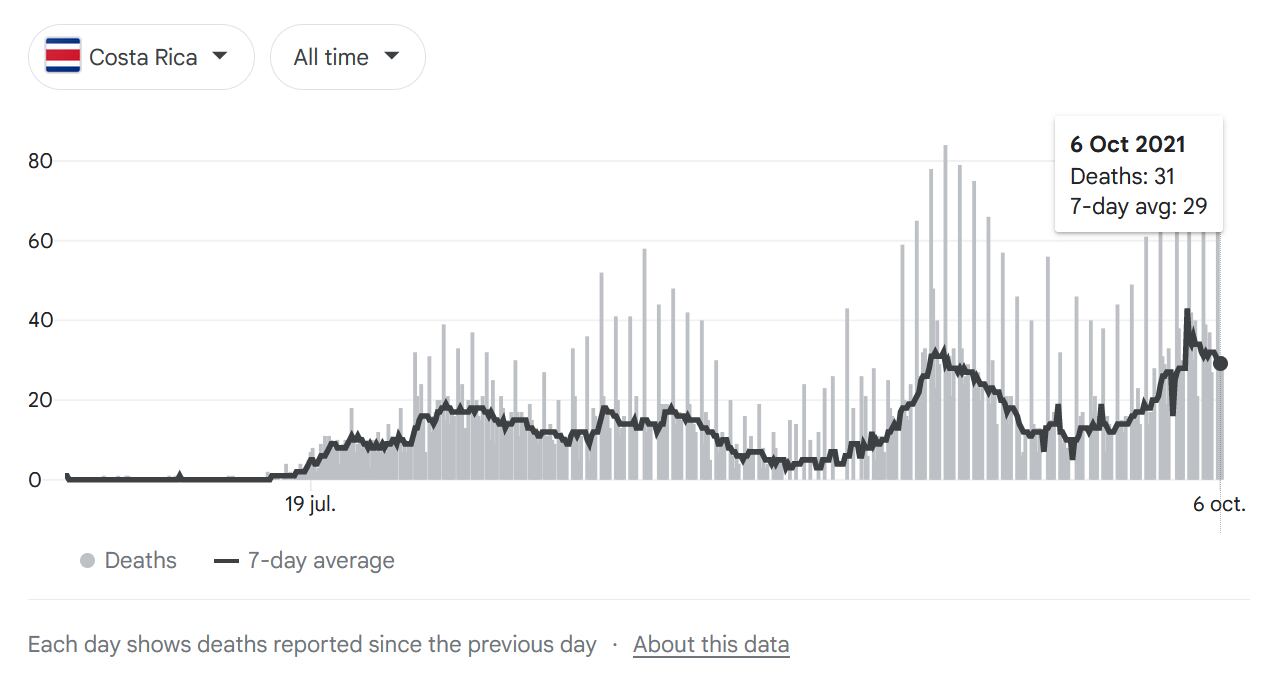 Volviendo a Centroamérica, en Costa Rica estas son las gráficas de casos y muertes de covid-19 comenzando octubre, con un 45% de la población está totalmente inmunizada: