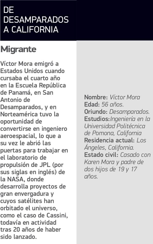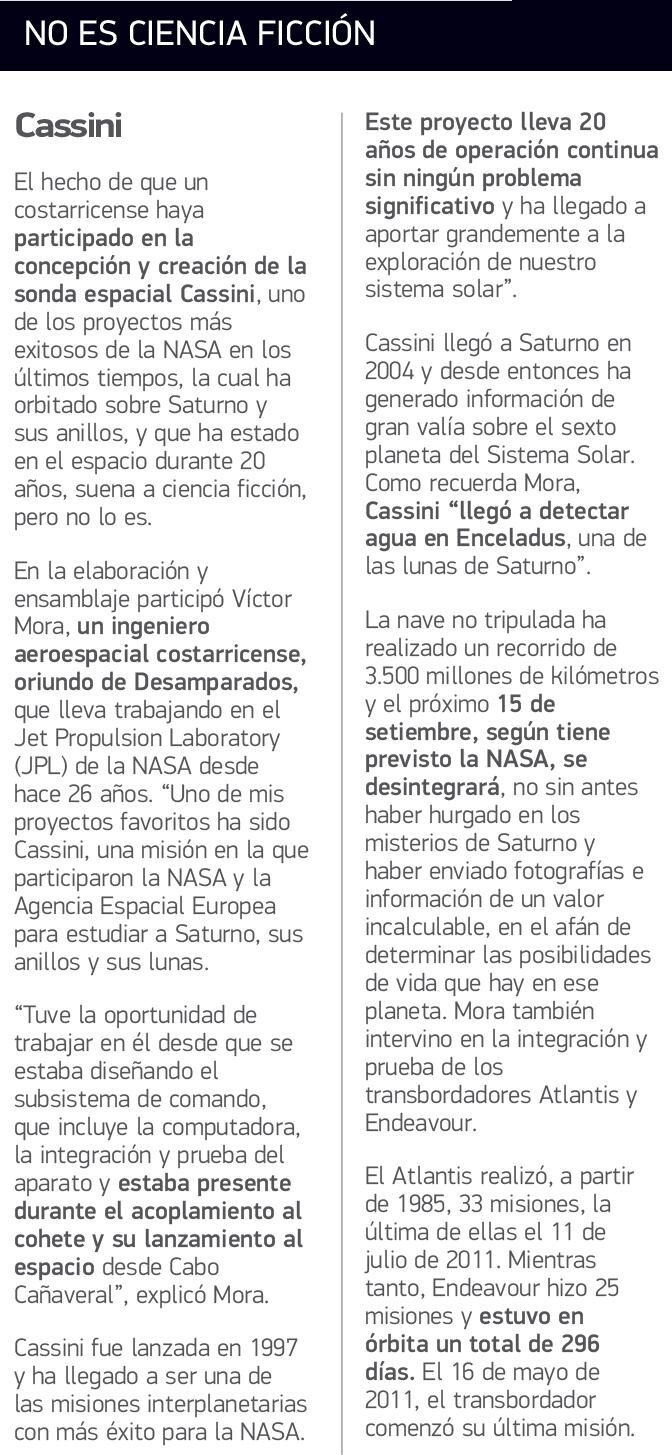 La sonda espacial Cassini, que por 20 años ha orbitado en el espacio y Saturno en busca de rastros diversos que ayuden al hombre en la Tierra a entender su devenir, se mueve en el espacio sideral, en mucho, gracias a la participación del costarricense Víctor Mora, que a sus 56 años confiesa que sus sueños han sido rebasados con creces por la realidad.