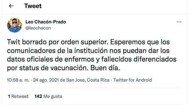 Menos de dos horas después de haber puesto el tuit, Chacón indicó en otro tuit que había borrado su publicación por “orden superior”.