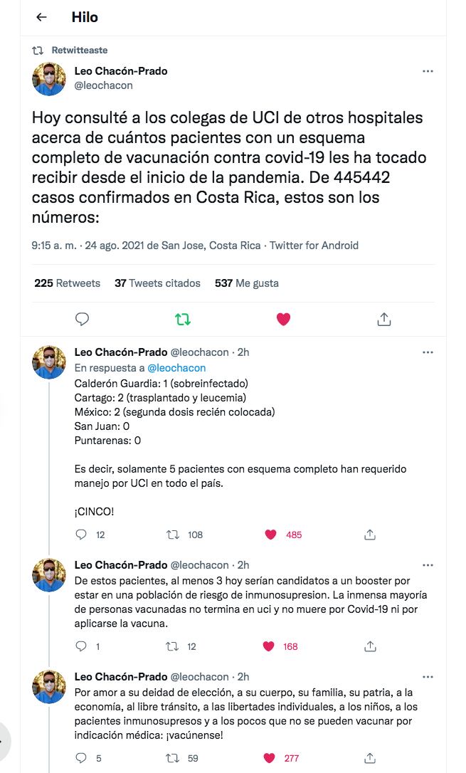 En una respuesta a la publicación de Twitter, el médico Christian Rodríguez Sandoval, quien labora en el hospital de Guápiles, centro médico donde no hay unidades de Cuidado Intensivo (UCI), indicó que ellos ven el mismo fenómeno.