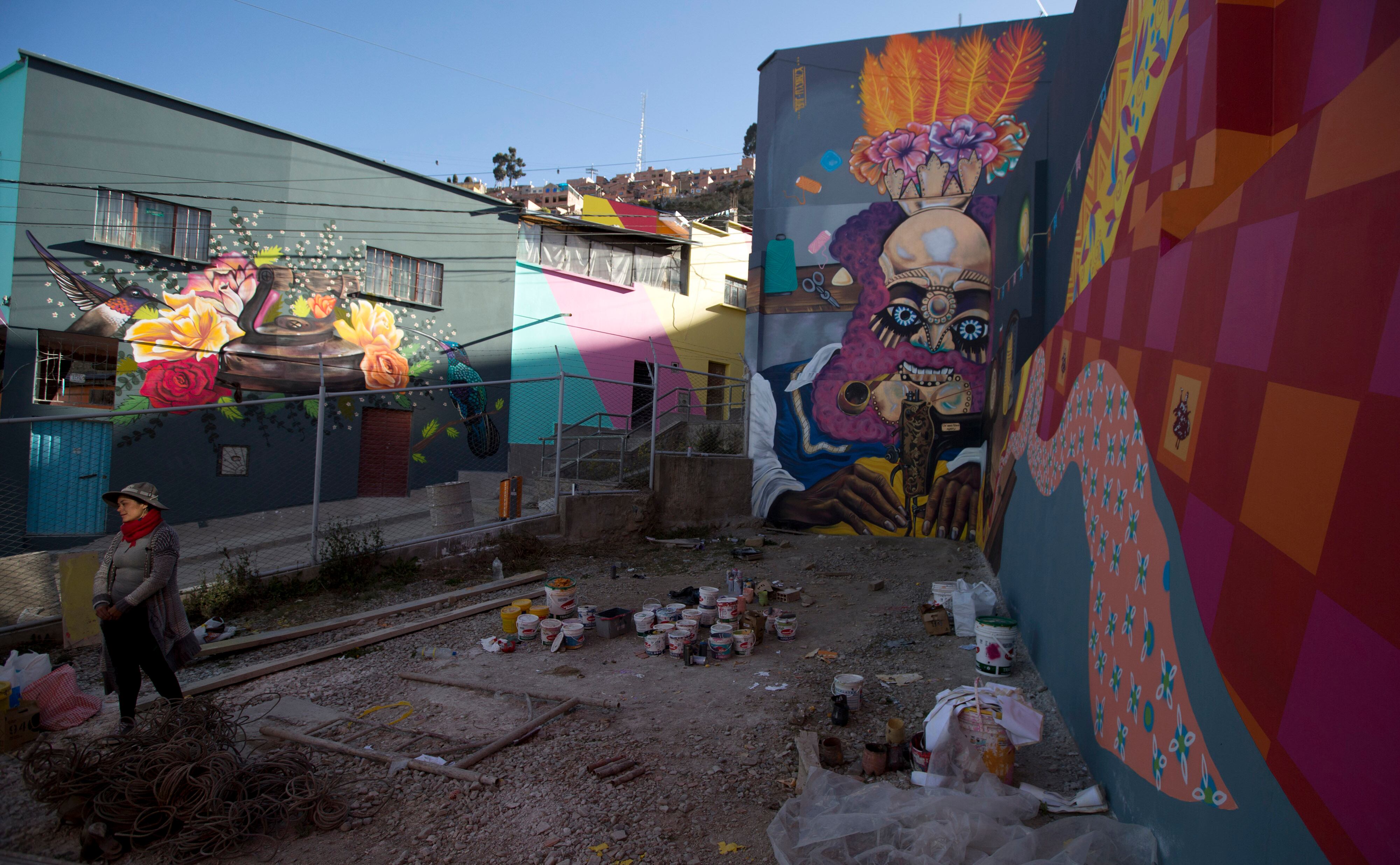 La Paz. Un barrio de adobe y ladrillos está siendo pintado de colores brillantes y pinturas de mujeres indígenas aymaras, colibríes y otras imágenes coloridas en un macromural que busca capturar el alma, cultura e identidad de las habitantes de esta ciudad.