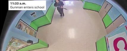 Un video de cámaras de seguridad la muestra caminando por los pasillos de la escuela, apuntando con un arma de asalto.
