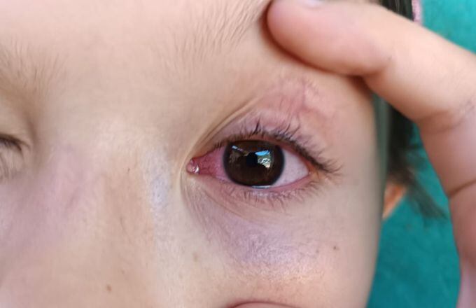 Raquel Calvo, una niña de 10 años que cursa el quinto grado de primaria, se recupera de un trauma en su ojo izquierdo luego de que un compañero de clase le pegara con una bomba plástica.