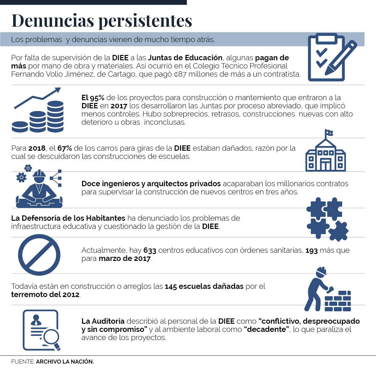 La Nación denunció en mayo del año pasado que un total de 12 ingenieros y arquitectos privados acapararon los millonarios contratos de supervisión de la construcción de centros educativos del MEP durante los últimos tres años. De más de 170 profesionales que las Juntas contrataron para esta labor del 2015 al 2017, estos 12 se dejaron una tercera parte de los contratos.